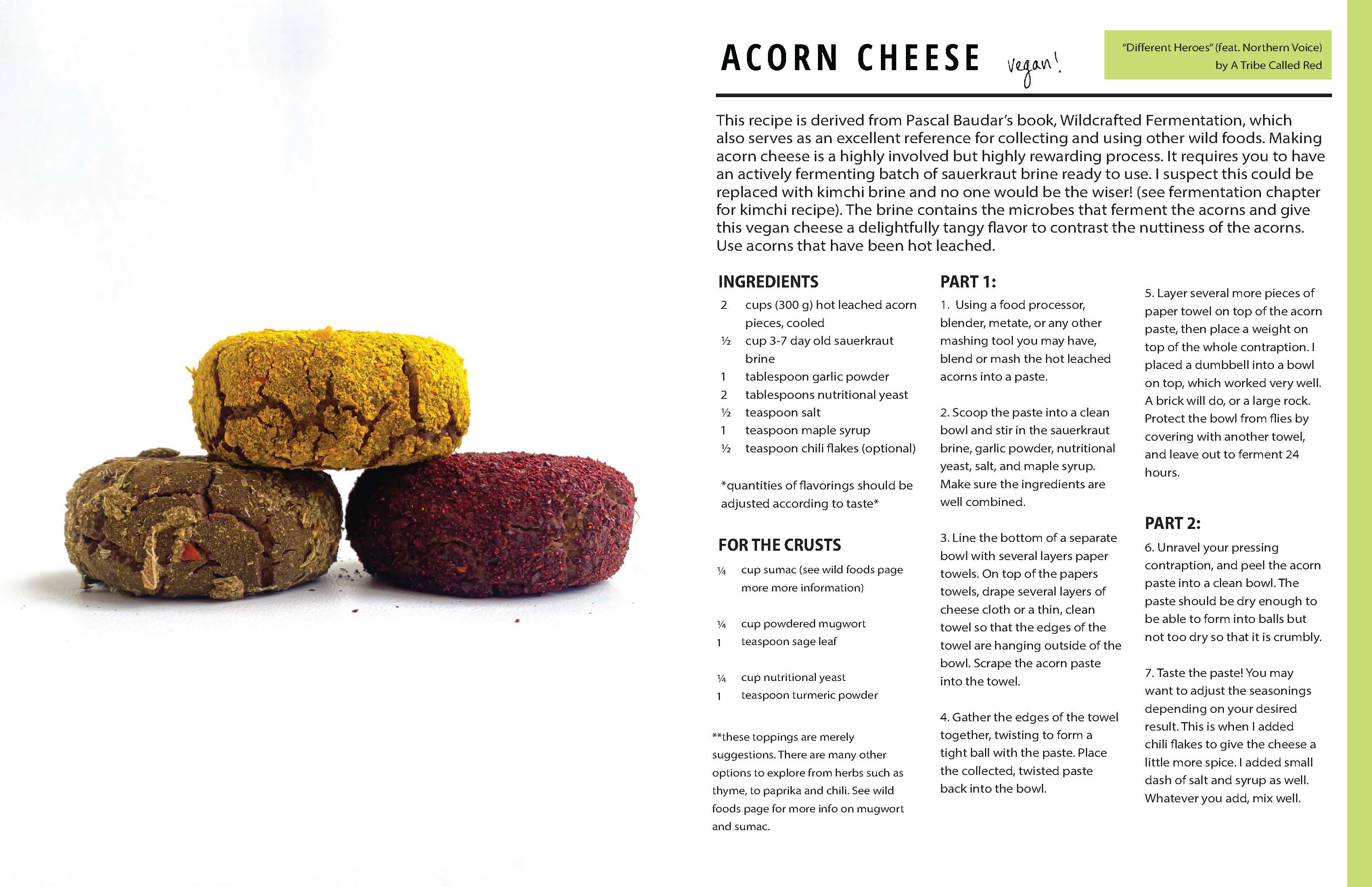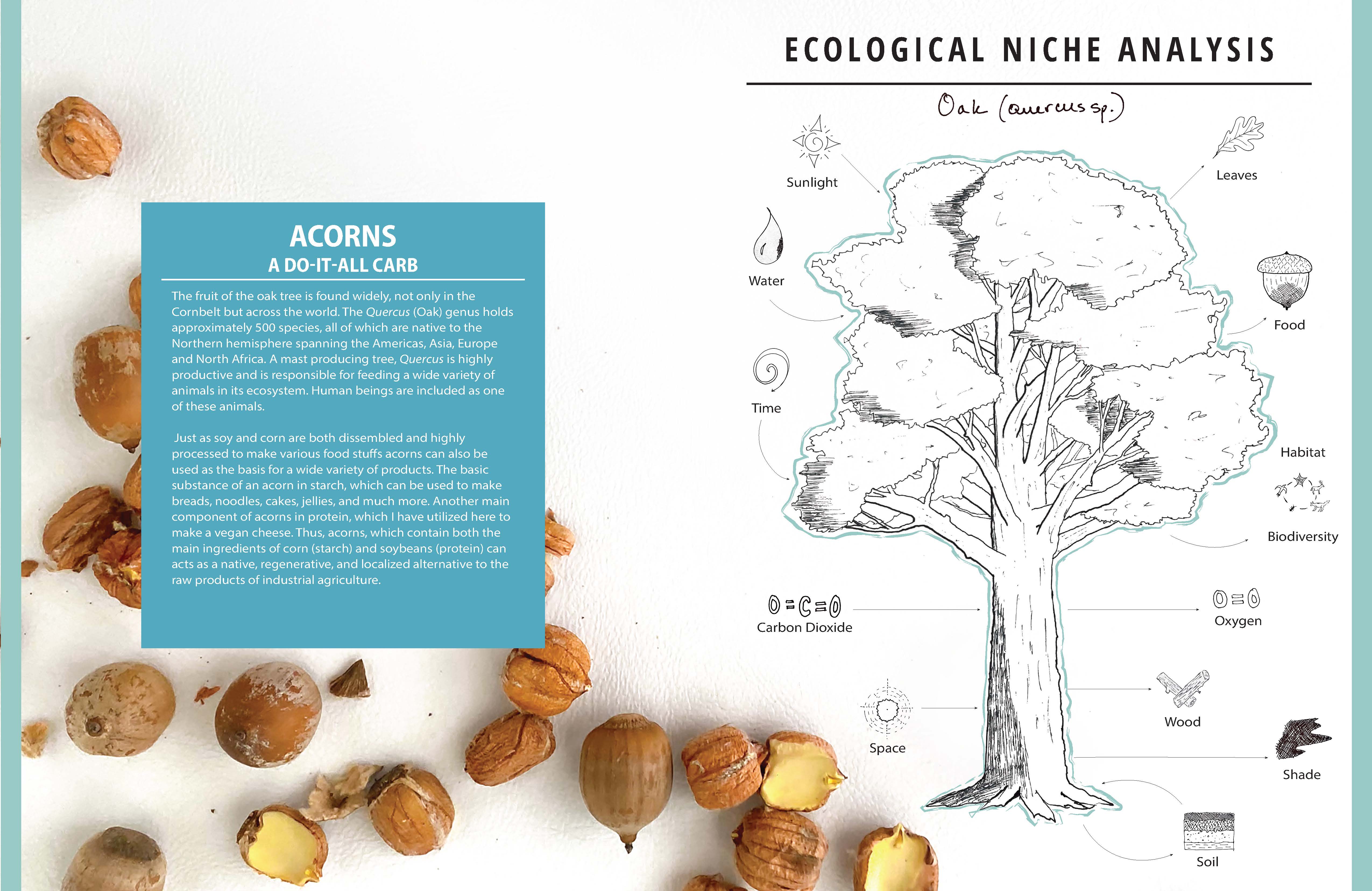 The final products of this project are a series of magazine spreads detailing methods of collecting and cooking acorns. The spreads were joined with other student’s work to form a cookbook that challenges the typical engagement with our industrialized food system.