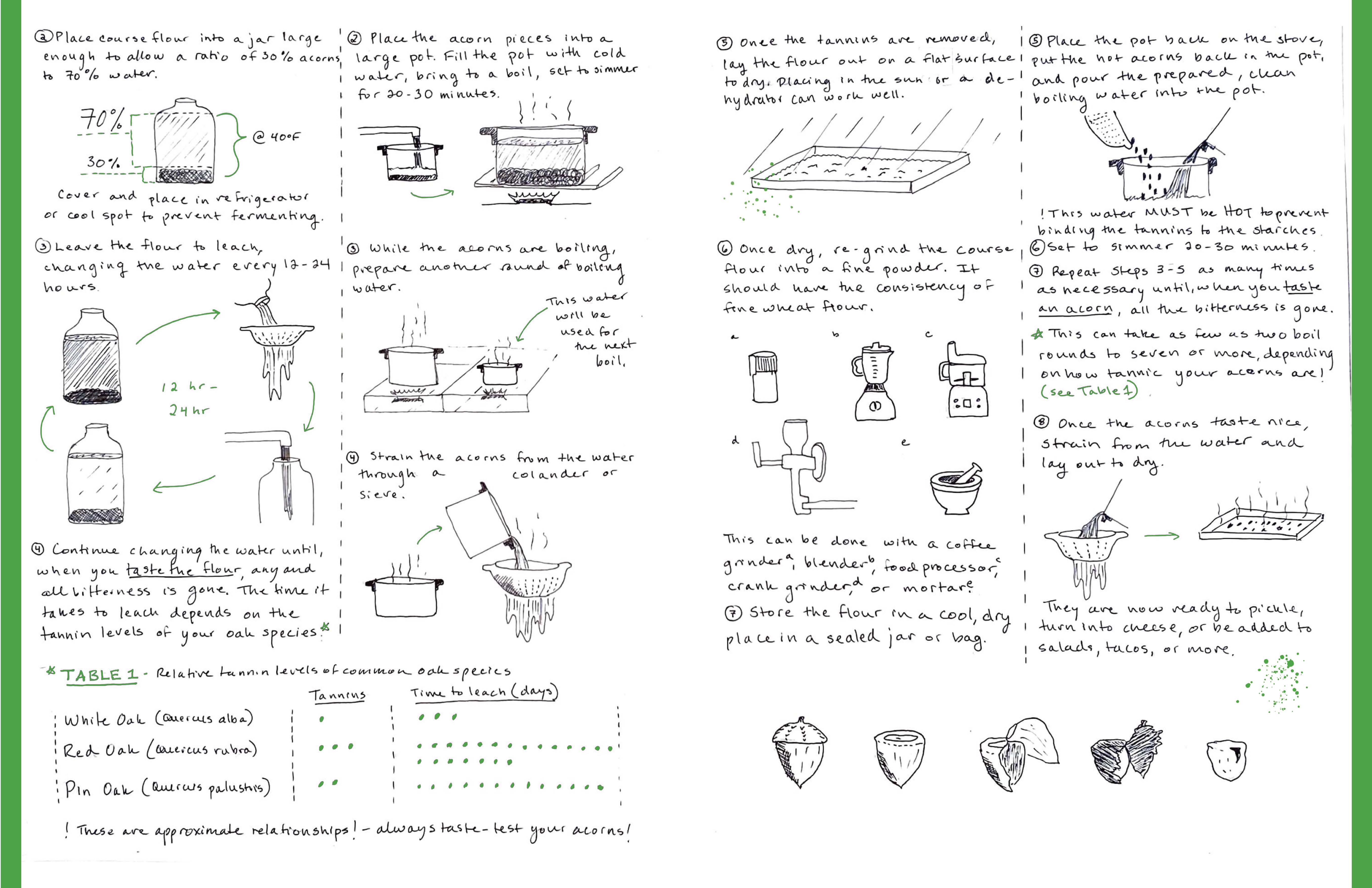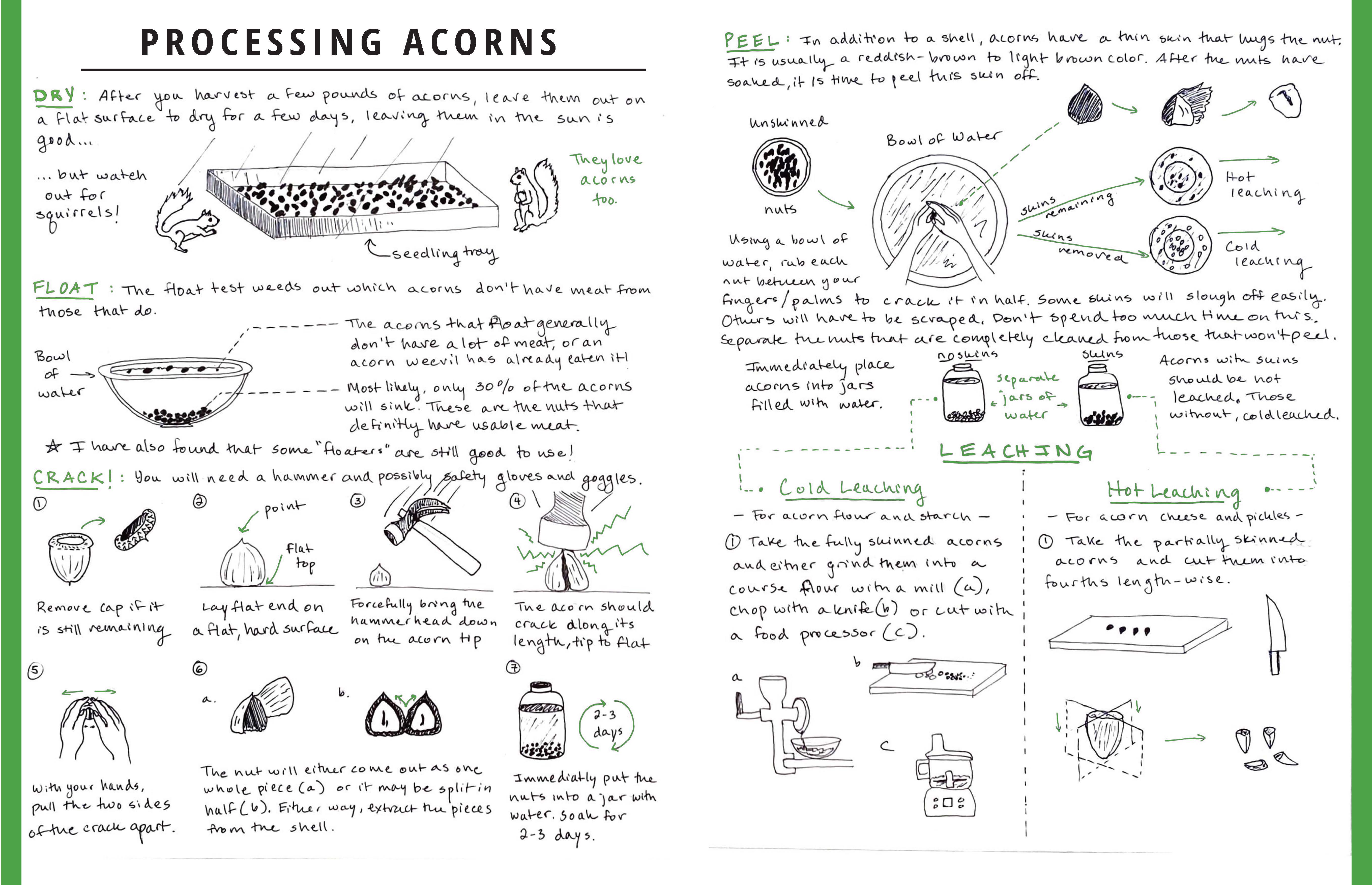 Engaging with these foods is a deeply subversive act. Wild food gathering requires a person to be physically involved with the landscape. It requires a certain ecological knowledge. It requires time and labor, and it requires ethics. In this specific study, I have landed on the deep exploration of acorns and their uses. The following pages dive deeply into the power and uses of oaks and acorns as well as why they are an appropriate counterpoint to both corn and soy as a biological substance.
