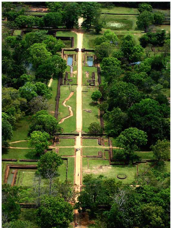The gardens in the west consist of the boulder garden (former homes of the monks), a symmetrical and formal water garden, and a four-quartered garden that strongly resembles the char bagh, found in Persian paradise gardens, though it predates these (fig. 6). The north of Sri Lanka, which endures severe drought during the dry season (see fig. 2) had by the 5th century, well-established public irrigation systems and reservoirs. [7] One such reservoir is located in the southeastern corner of the lion rock and is the main supply of water that feeds the flowing, tiered fountain system in the water garden. While the form of the gardens is aligned with the puritan aesthetic ideals of the orthodox Theravāda and relies on simple, harmonious proportions rather than ornamentation, the water gardens also contain a number of facilities that connote the use of the space for pleasure.
