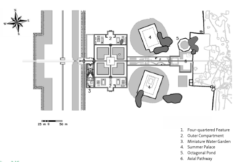 This is further enforced when considering the main cosmological world order of Buddhism, defined by the mythical Mount Meru, “…which lies at the center of the universe [and] is thought to be the axis mundi joining the earth with abodes of the Brahmas at the highest planes.” [5] The lion rock lies at the center of the site and is bisected by a strong east-west axis (fig. 5) that leads to the western precinct; the gardens. The eastern precinct is unexcavated but thought most likely to be residential. The alignment of the site to the cardinal directions, the centering of the lion rock, and the fact that the palace is raised up as if it were “[the] heavenly abode of god Sakra …on the summit of Mount Meru,” converge symbolically to align King Kasyapa with powerful forces, reinforcing his own power. [6]